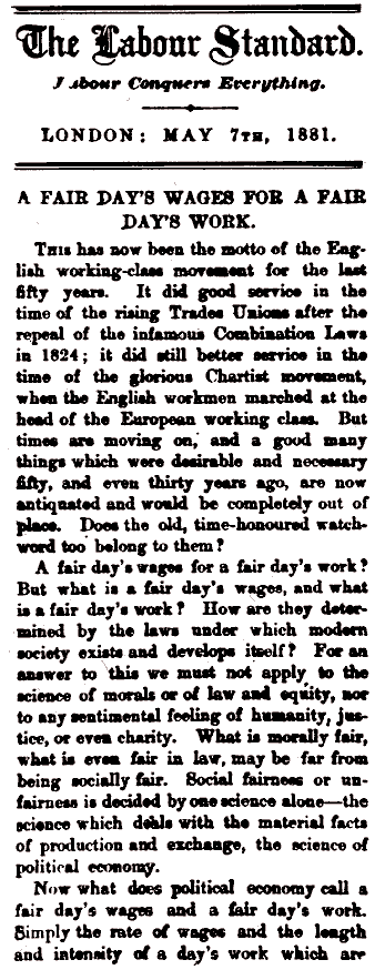 He held up trade unions as the daily defenders of the working class in that struggle. In the first article, Engels said the labor movement should lose the meaningless slogan "A Fair Day's Wages for a Fair Day's Work" — since capitalism's internal nature prevents capitalists from being "fair" to the workers whose wages they must continually seek to depress — with the slogan: "Possesion of the means of work — raw material, factories, machinery — by the working people themselves!"