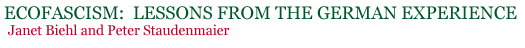 IntroductionFor most compassionate and humane people today, the ecological crisis is a source of major concern. Not only do many ecological activists struggle to eliminate toxic wastes, to preserve tropical rainforests and old-growth redwoods, and to roll back the destruction of the biosphere, but many ordinary people in all walks of life are intensely concerned about the nature of the planet that their children will grow up to inhabit. In Europe as in the United States, most ecological activists think of themselves as socially progressive. That is, they also support demands of oppressed peoples for social justice and believe that the needs of human beings living in poverty, illness, warfare, and famine also require our most serious attention. For many such people, it may come as a surprise to learn that the history of ecological politics has not always been inherently and necessarily progressive and benign. In fact, ecological ideas have a history of being distorted and placed in the service of highly regressive ends--even of fascism itself. As Peter Staudenmaier shows in the first essay in this pamphlet, important tendencies in German "ecologism," which has long roots in nineteenth-century nature mysticism, fed into the rise of Nazism in the twentieth century. During the Third Reich, Staudenmaier goes on to show, Nazi "ecologists" even made organic farming, vegetarianism, nature worship, and related themes into key elements not only in their ideology but in their governmental policies. Moreover, Nazi "ecological" ideology was used to justify the destruction of European Jewry. Yet some of the themes that Nazi ideologists articulated bear an uncomfortably close resemblance to themes familiar to ecologically concerned people today. As social ecologists, it is not our intention to deprecate the all-important efforts that environmentalists and ecologists are making to rescue the biosphere from destruction. Quite to the contrary: It is our deepest concern to preserve the integrity of serious ecological movements from ugly reactionary tendencies that seek to exploit the widespread popular concern about ecological problems for regressive agendas. But we find that the "ecological scene" of our time--with its growing mysticism and antihumanism--poses serious problems about the direction in which the ecology movement will go. In most Western nations in the late twentieth century, expressions of racism and anti-immigrant sentiments are not only increasingly voiced but increasingly tolerated. Equally disconcertingly, fascist ideologists and political groups are experiencing a resurgence as well. Updating their ideology and speaking the new language of ecology, these movements are once again invoking ecological themes to serve social reaction. In ways that sometimes approximate beliefs of progressive-minded ecologists, these reactionary and outright fascist ecologists emphasize the supremacy of the "Earth" over people; evoke "feelings" and intuition at the expense of reason; and uphold a crude sociobiologistic and even Malthusian biologism. Tenets of "New Age" eco-ideology that seem benign to most people in England and the United States--specifically, its mystical and antirational strains--are being intertwined with ecofascism in Germany today. Janet Biehl’s essay explores this hijacking of ecology for racist, nationalistic, and fascist ends. Taken together, these essays examine aspects of German fascism, past and present, in order to draw lessons from them for ecology movements both in Germany and elsewhere. Despite its singularities, the German experience offers a clear warning against the misuse of ecology, in a world that seems ever more willing to tolerate movements and ideologies once regarded as despicable and obsolete. Political ecology thinkers have yet to fully examine the political implications of these ideas in the English-speaking world as well as in Germany. What prevents ecological politics from yielding reaction or fascism with an ecological patina is an ecology movement that maintains a broad social emphasis, one that places the ecological crisis in a social context. As social ecologists, we see the roots of the present ecological crisis in an irrational society--not in the biological makeup of human beings, nor in a particular religion, nor in reason, science, or technology. On the contrary, we uphold the importance of reason, science, and technology in creating both a progressive ecological movement and an ecological society. It is a specific set of social relations--above all, the competitive market economy--that is presently destroying the biosphere. Mysticism and biologism, at the very least, deflect public attention away from such social causes. In presenting these essays, we are trying to preserve the all-important progressive and emancipatory implications of ecological politics. More than ever, an ecological commitment requires people today to avoid repeating the errors of the past, lest the ecology movement become absorbed in the mystical and antihumanistic trends that abound today.