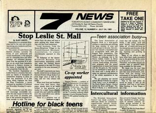 Seven News (7 News) was a community newspaper published in Toronto's Ward 7. Seven News was published bi-weekly by the Ward Seven Newspaper Organization from 1970 to 1985. During this time, Ward 7 covered the area of Toronto east of downtown, from Sherbourne Street to Logan Avenue, south of Bloor-Danforth, including Don Vale, Cabbagetown, Regent Park, Riverdale, and St. Jamestown.
