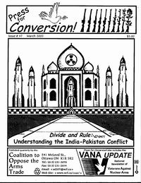 This issue begins with a series of articles examining the historical context of the conflict between India and Pakistan. Much of the blame is laid on (1) British colonialism, and its "divide-and-conquer" policies that culminated in partition, and (2) the U.S. use of Pakistan as a military client state during the Cold War. When the CIA fought its biggest covert, proxy war in Afghanistan, it used Pakistan as a conduit for arming, financing, training and equipping the fundamentalist, Islamist mujahadeen. This was a deliberate effort to provoke the Soviet Union to become embroiled in the war. This US support for terrorism had its repercusions on Indo-Pakistani politics. The particularly thorny issue of Kashmir as a potential flashpoint for nuclear conflict, between India and Pakistan is also explored in a number of articles. Also examined is the issue of the arms trade and Canada's role helping to arm these two countries.