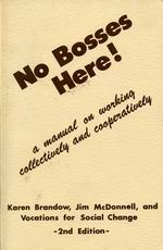 No Bosses Here is a guide to creating and maintaining collective work environments. These environments allow employees to work co-operatively without a hierarchical system. The guide explains the benefits of such an environment while providing tips and insight into some of the problems that can arise. The writers advocate alternative organizations and describe how they can be part of co-operative living for a new society.