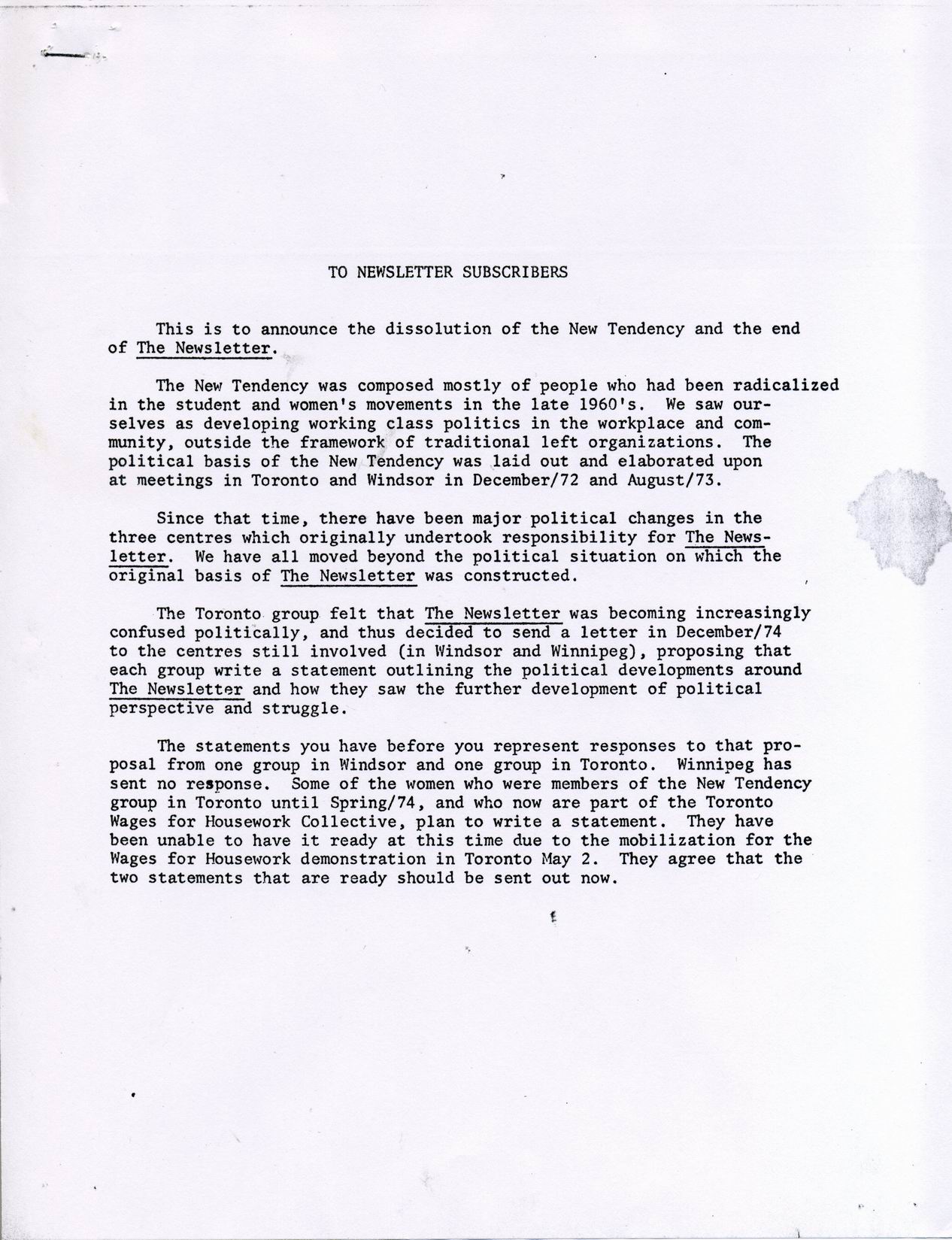 ‘The Newsletter’ was published in 1973 and 1974 by the New Tendency, a loose collaboration of independent leftists primarily based in Toronto, Windsor, Winnipeg, and Kitchener-Waterloo. Articles dealt with workplace issues, labour unions, workers autonomy and related topics. A total of five-and-a-half issues were published. Copies of the newsletters are available in the Connexions Archive and online on the Connexions website.