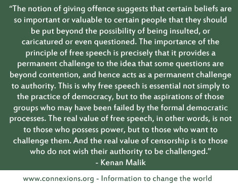The notion of giving offence suggests that certain beliefs are so important or valuable to certain people that they should be put beyond the possibility of being insulted, or caricatured or even questioned. The importance of the principle of free speech is precisely that it provides a permanent challenge to the idea that some questions are beyond contention, and hence acts as a permanent challenge to authority. This is why free speech is essential not simply to the practice of democracy, but to the aspirations of those groups who may have been failed by the formal democratic processes. The real value of free speech, in other words, is not to those who possess power, but to those who want to challenge them. And the real value of censorship is to those who do not wish their authority to be challenged.