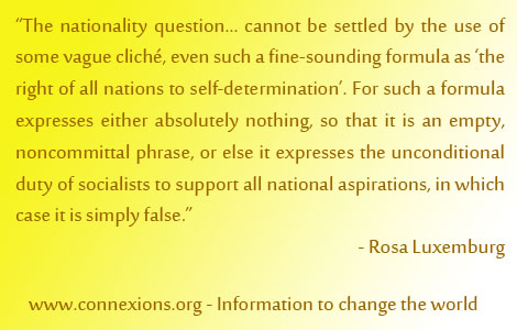 The nationality question... cannot be settled by the use of some vague cliché, even such a fine-sounding formula as “the right of all nations to self-determination”. For such a formula expresses either absolutely nothing, so that it is an empty, noncommittal phrase, or else it expresses the unconditional duty of socialists to support all national aspirations, in which case it is simply false.