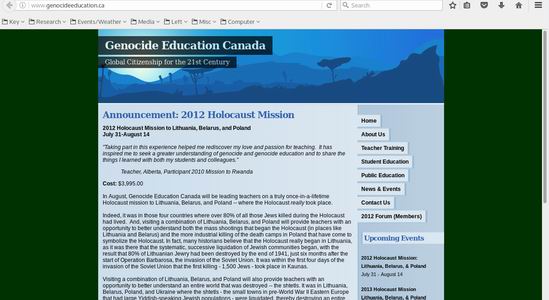 Purpose: The mission of the Foundation for Genocide Education is to encourage teachers to teach the lessons of genocide - the importance of tolerance, of upholding human rights and democracy, and of helping others in need - and to help prepare them to effectively communicate those lessons in the classroom so that students will be challenged to think critically about the world that they live in and their role in it and be empowered to affect positive change as global citizens in the 21st Century. To that end, the Centre offers the Genocide Education Institute, a five-day institute that is held in Toronto each summer for teachers from across Canada, and full-day workshops with secondary school students.