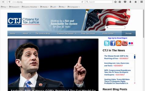 Purpose: Citizens for Tax Justice is a public interest research and advocacy organization focusing on federal, state and local tax policies and their impact upon our nation. CTJ's mission is to give ordinary people a greater voice in the development of tax laws. Against the armies of special interest lobbyists for corporations and the wealthy, CTJ fights for: * Fair taxes for middle and low-income families * Requiring the wealthy to pay their fair share * Closing corporate tax loopholes * Adequately funding important government services * Reducing the federal debt * Taxation that minimizes distortion of economic markets